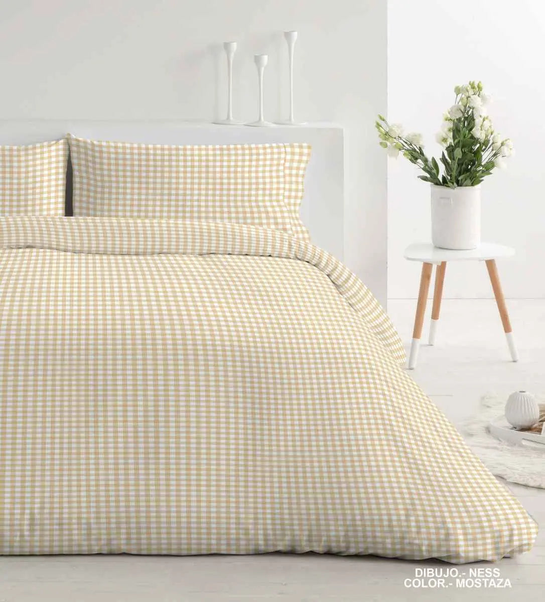 Funda nórdica de 2 piezas Ness, en color mostaza, de la marca Polo Polo . Incluye 2 o 3 piezas: funda nórdica y 1 o 2 fundas de almohada (dependiendo de la medida) . Acabado de la funda abierta por los pies. Bajera no incluida. Confeccionada en 50% algodón 50% poliéster de 144 hilos, con estampación digital de cuadros vichy.