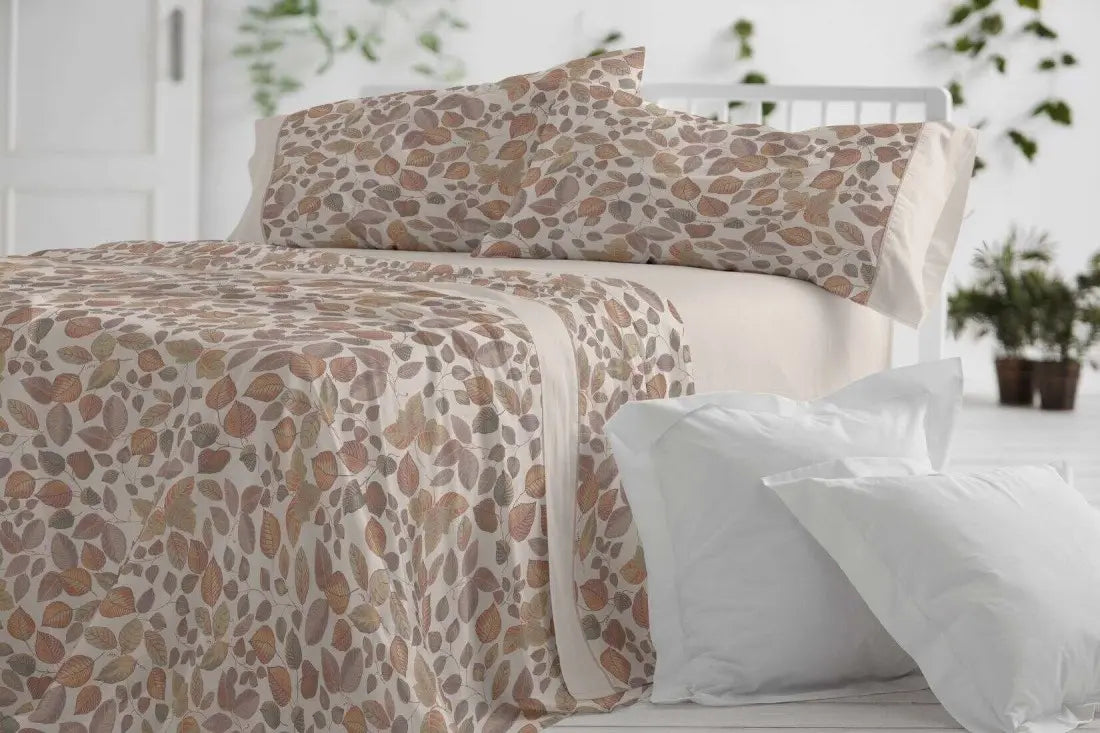 Juego de sábanas de tela, referencia 049, en color canela, de la marca Burrito Blanco. Tonos cálidos de la naturaleza en estas sábanas de Burrito Blanco, con un diseño botánico en teja, camel, beige, canela, piedra y salvia sobre un fondo beige claro. El embozo de la sábana encimera, la bajera ajustable y las bocas almohada en beige claro, con un ribete de adorno en camel. Son sábanas calidad Burrito Blanco, las de toda la vida. Conjunto de sábanas ideal para colchones altos de hasta 32 cm.